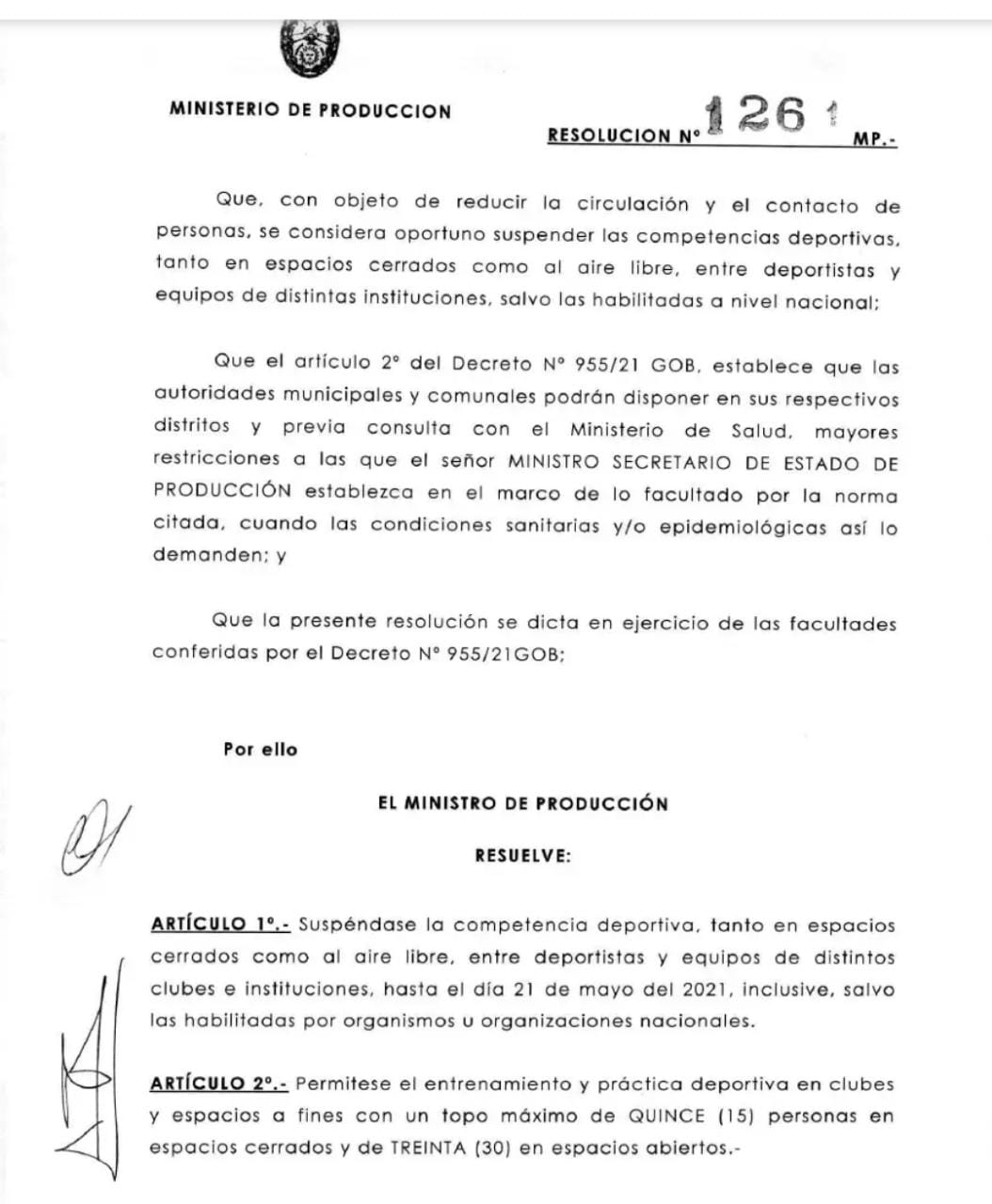 A través de la resolución 1261 del Ministerio de la Producción, fueron suspendidas las competencias deportivas en lugares cerrados y abiertos hasta el 21 de mayo a excepción de las que cuenten con habilitación nacional.