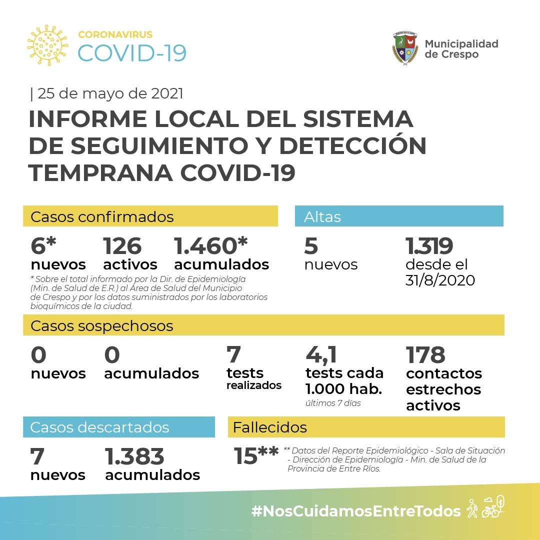 El informe brindado por el municipio de Crespo consigna 6 nuevos contagios durante las últimas 24 Hs. Al día de hoy 126 personas transitan la enfermedad.