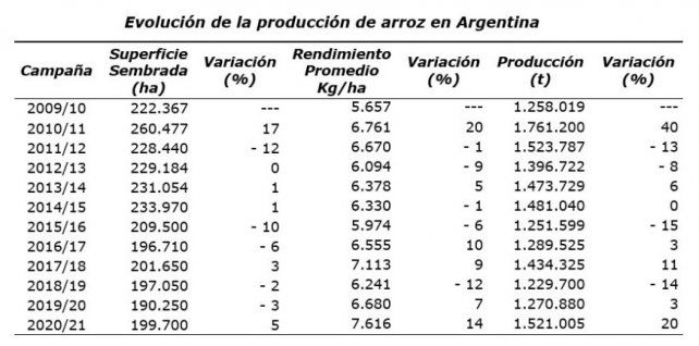 La cosecha 2020/21 de arroz en Argentina cerró con muy buenos números: con una superficie sembrada de 199.700 hectáreas y un rendimiento promedio de 7.616 kilos por hectárea, se alcanzó una producción de 1.521.005 toneladas, según el informe que dieron a conocer las Bolsas de Comercio de Santa Fe y Chaco, la Asociación Correntina de Plantadores de Arroz y la Bolsa de Cereales de Entre Ríos.