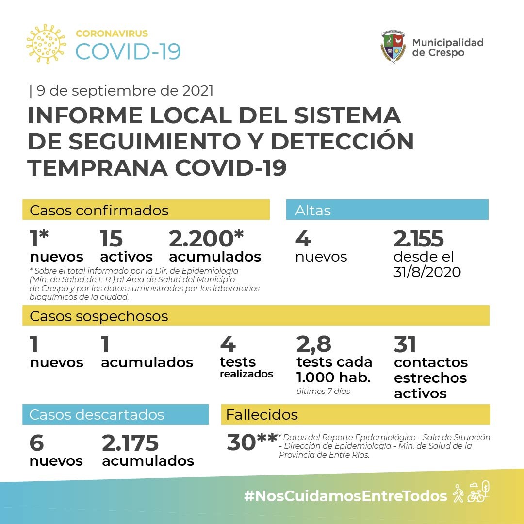 El área de Vigilancia Epidemiológica del Ministerio de Salud confirmó que en Entre Ríos este jueves 9 de septiembre se registraron 101 nuevos casos de coronavirus. En la ciudad de Crespo se registró un caso.