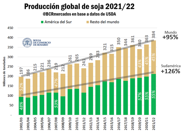 El estudio agrega que, en las últimas 20 campañas, la producción mundial de soja se incrementó en un 95%: "El volumen cosechado pasó de 197 Mt en 2002/03 a un estimado de 384 Mt en 2021/22, casi duplicándose". Mas allá de este contundente incremento en la producción global, las cosechas de soja sudamericana mostraron un crecimiento aún más espectacular en el mismo período. La producción regional pasó de 93,9 Mt en 2002/03 a un estimado de 212,3 Mt en 2021/22, exhibiendo un crecimiento del 126% y más que duplicándose. En 2021/22 el cono sur superaría por primera vez la barrera productiva de 200 Mt. De acuerdo con datos del USDA, se espera que Brasil consolide una cosecha de 144 Mt, equivalente al total de la producción Sudamericana unos pocos años atrás, en la campaña 2012/13.