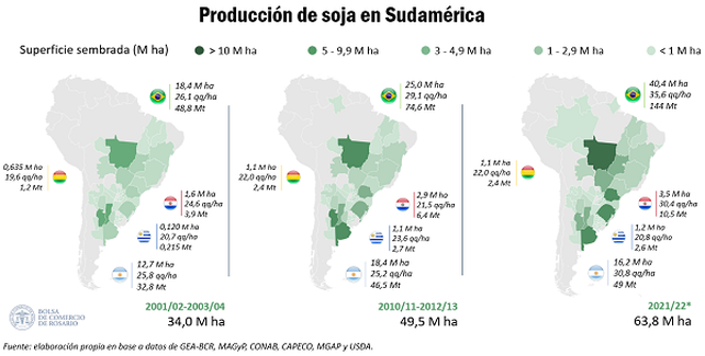 "No sorprende que en materia de producción Brasil continúe siendo el líder indiscutido. De cara al ciclo 2021/22 el gigante sudamericano cosecharía 144 Mt -casi 3 veces su cosecha promedio 2002/02-2003/04-, Argentina 49 Mt -50% más-, Paraguay 10,5 Mt -más que duplicando producción-, Uruguay 2,6 -unas 12 veces más- y Bolivia 2,4 Mt -duplicando cosecha en 20 años-", cierra el informe de la Bolsa rosarina.