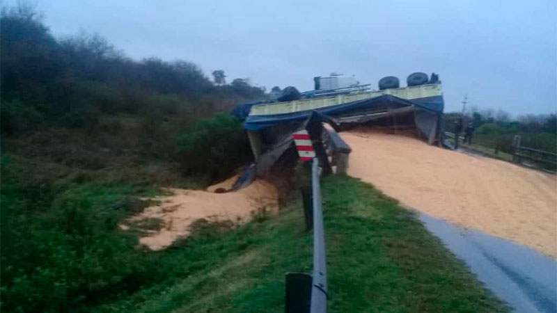Una parte del camión quedó en la cinta asfáltica y el acoplado cayó a la banquina desde un puente. Como consecuencia del accidente, el conductor no sufrió lesiones, pero parte de la carga de maíz, quedó sobre la cinta asfáltica. Uno de los carriles de la Ruta 12 estaba cortado y se trabajaba en el lugar para retirar el camión con acoplado, pudo conocer El Once.
