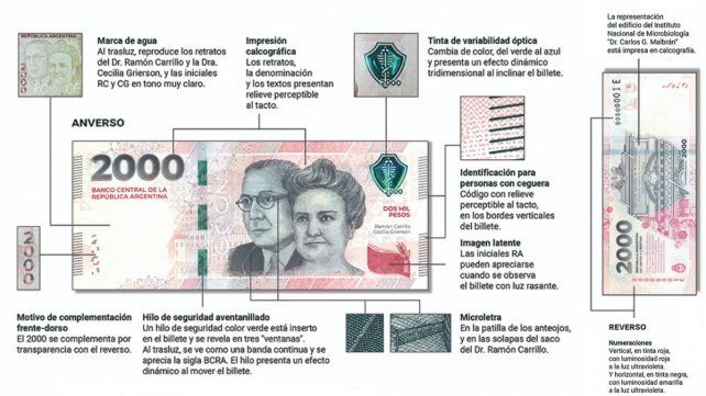 Diseñado en colaboración con Casa de Moneda Argentina, el billete de 2000 pesos cuenta, entre otras, con las siguientes medidas de seguridad: