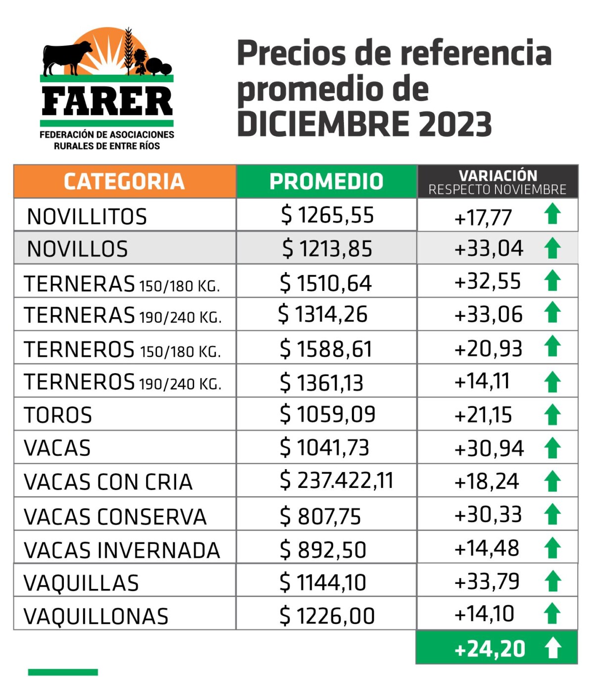 En síntesis, los precios promedios que arrojaron los remates en la provincia de Entre Ríos en el mes de diciembre de 2023 fueron los siguientes: