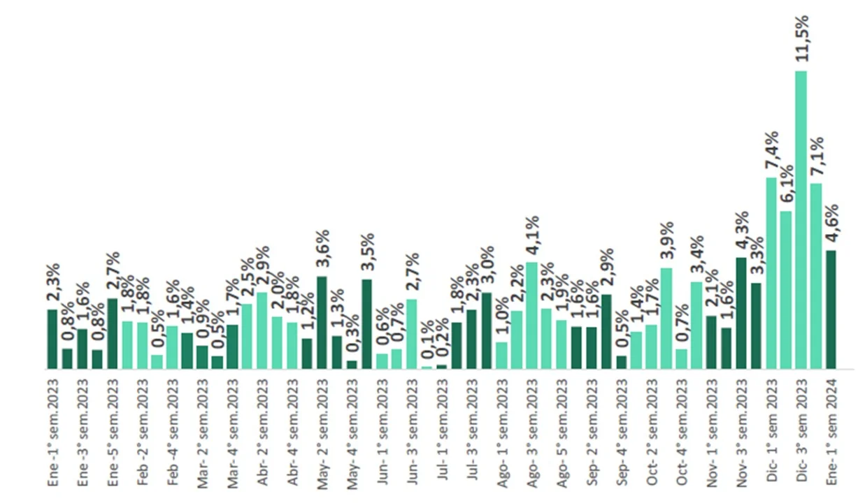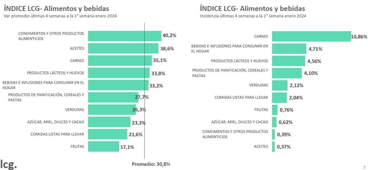 La primera semana de enero cerró con una inflación de 4,6% en alimentos y bebidas, según la consultora LCG. De esta manera, si bien desaceleró 2,6 puntos porcentuales respecto a la semana anterior, la suba promedia 30,8% en las últimas 4 semanas y 32,5% punta a punta en el mismo período .