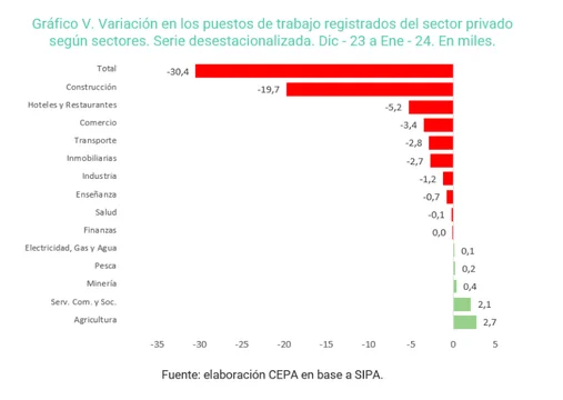 La paralización de la obra pública y del consumo destruyeron 19,7 mil puestos en la construcción; 5,2 mil en hoteles y restaurantes y 3,4 mil en comercio. Y 2024 recién empezaba.