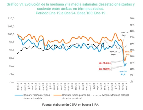El panorama a diciembre de 2023 mostraba a los empleos registrados que alcanzaban los 13.357.000 trabajadores: los salarios privados con una caída del 30,9%, los públicos un -20,2%; los reales totales un -18,9%, y los privados registrados un -14,6%.