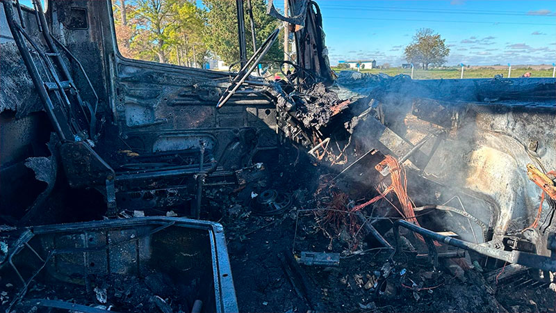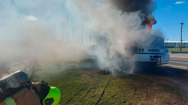 El fuego se inició en la cabina del camión con acoplado y pese a los esfuerzos del chofer, no logró sofocarlo. Sin embargo, alcanzó a desenganchar el acoplado y retirar las jaulas para pollos que trasladaba. Ocurrió en Sauce Pinto. Fotos.