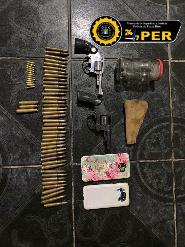 Asimismo, se secuestraron en legajo complementario, dos armas de fuego -tipo revólver-, un total de 13 cartuchos calibre 22 mm, 41 cartuchos calibre 7,65 mm, y 11 plantines de Cannabis Sativa -Marihana-, como así también 2 teléfonos celulares, que serán pasibles de pericias por parte de la Dirección Inteligencia Criminal de la Policía de Entre Ríos.