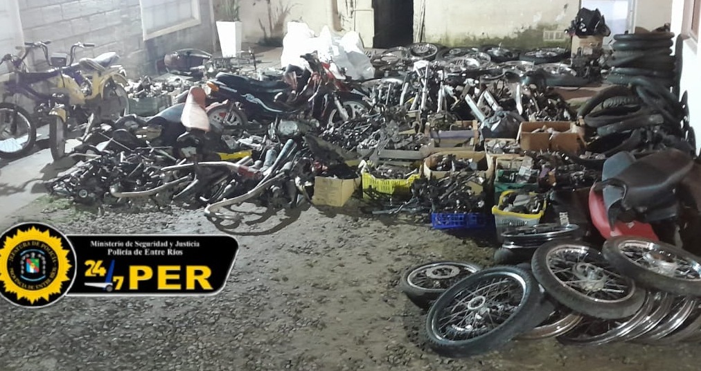 FM Estación Plus Crespo pudo confirmar que los recientes allanamientos arrojaron resultados satisfactorios, procediéndose al secuestro de: 3 motos, 2 cuadros, 12 motores, 27 block, 4 tapas de cilindros, 56 carburadores, 1 caja de cambio, 10 cárter, 36 amortiguadores, 16 tableros, 80 cachas y bauleras, 11 caños de escapes, 14 cubiertas, 30 barrales, 34 horquillas traseras, 21 cámaras, 13 baterías, 24 llantas, 18 llantas con cubiertas, 45 manubrios, 18 tanques de combustible, 26 asientos, 29 camisas, 27 tapas de motor, 60 ejes, 19 cristos, gran cantidad de cableado eléctrico y engranajes varios.