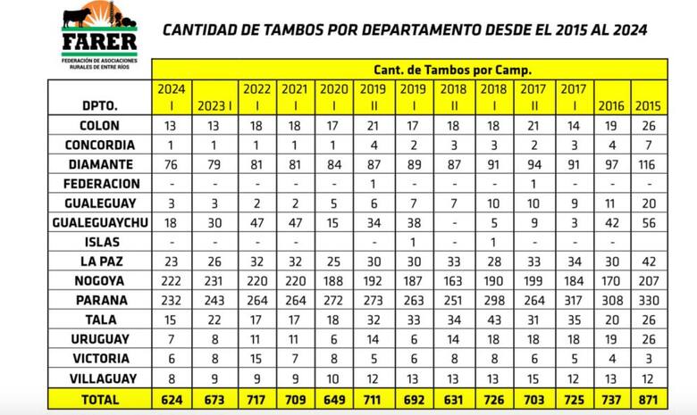 El esplendor de los tambos familiares entrerrianos se ha ido desvaneciendo e incluso, se acelera el proceso de decaimiento, por múltiples factores, que requieren respuestas urgentes de parte de las autoridades. Entre Ríos es una provincia que no deja de perder tambos. Así lo revela un informe de la Federación de Asociaciones Rurales de Entre Ríos (Farer), que da cuenta del cierre de 49 puntos de producción lechera en el último año. Sólo quedan en la provincia 624 establecimientos lecheros y se pasó de 84.187 vacas en producción a 60.405 cabezas, una caída del orden del 18% o una pérdida de 14.782 vacas.