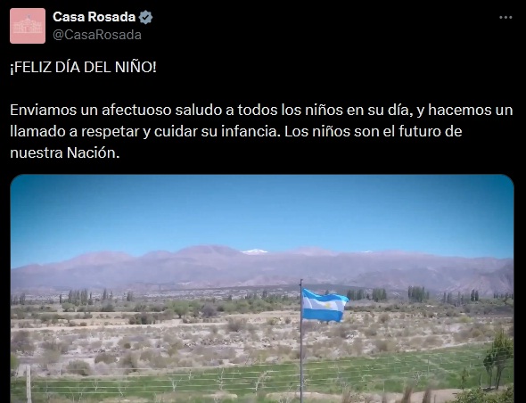 La vicepresidenta Victoria Villarruel también saludó a los niños en su día. A través de un mensaje publicado en su cuenta de la red social X, pidió “por una Argentina donde cada niño pueda comer, educarse, vestirse y vivir su infancia rodeado del amor y cobijo de todo el pueblo argentino”.