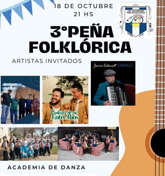 El 18 de octubre tendrá lugar la Peña, sobre lo cual el rector comentó: "Comenzará a las 21:00. Tenemos la participación de diversos artistas, una excelente calidad musical y de baile sobre el escenario. Nos preparamos para recibir a los vecinos y gente de la zona, a pasar una muy linda noche. La entrada anticipada tiene un valor de $3.000, en puerta costará $3.500, y los menores de 12 años pagan sólo $1.800. Tenemos un espacio con capacidad para 300 personas, por lo que si adquieren su entrada será mucho mejor. Nos interesa brindar comodidad, y un buen servicio de cantina, que estará a cargo de la Cooperadora. Se van a vender choripanes, empanadas, bebidas, pastelitos y otras elaboraciones dulces, ya que el espectáculo se presta para acompañarlo con el mate".
