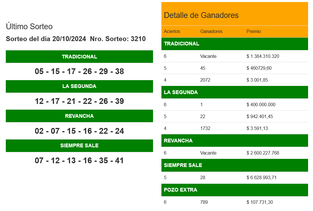 En cuanto al sorteo Tradicional, los números que salieron fueron 05, 15, 17, 26, 29 y 38, pero no hubo ningún ganador, por lo que el pozo quedó vacante y acumula $1.384.310.320 para el próximo sorteo.