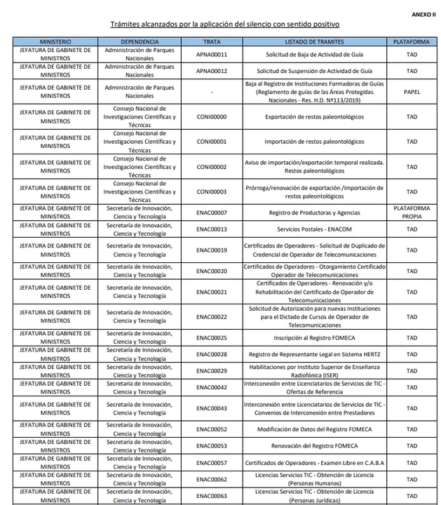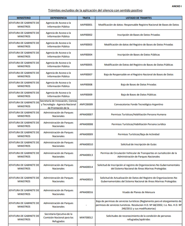 El Decreto 971/2024 se complementa con dos anexos que definen con precisión cuáles son los trámites sujetos al silencio positivo y cuáles están excluidos de su aplicación. En el Anexo I se incluyen aquellos trámites exceptuados del silencio positivo, como autorizaciones en áreas sensibles y servicios esenciales, y en el Anexo II se listan los procedimientos en los que sí aplicará el silencio positivo. Estos anexos abarcan trámites desde autorizaciones ambientales hasta registros de datos personales y permisos turísticos.
