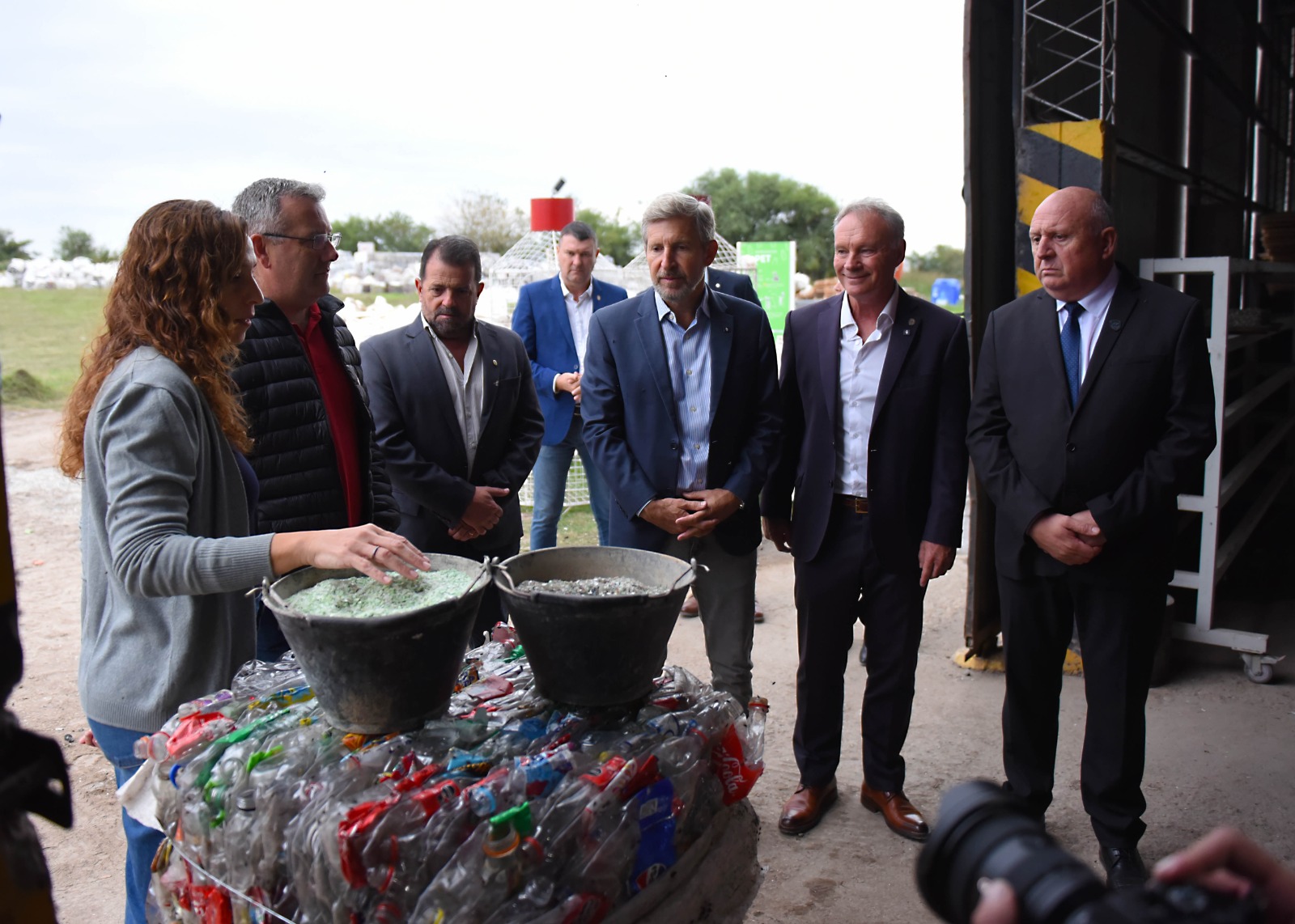 Con imágenes tomadas durante el paso del mandatario por el Parque Ambiental de Crespo, donde se ejecutan los  procesos de reciclado de los distintos tipos de residuos, Frigerio expresa delante de una montaña de botellas plásticas: "Esto que van acá, no va a terminar en un basural. Con un millón de botellas, vamos a construir tres aulas, que van a ser las primeras del país totalmente construidas con ladrillos reciclados".