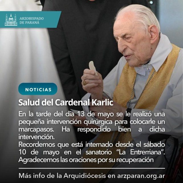 El Arzobispado de Paraná confirmó que el cardenal y arzobispo emérito Estanislao Esteban Karlic fue sometido a una intervención quirúrgica para la colocación de un marcapasos. El procedimiento se realizó este martes 13. "Ha respondido bien a dicha intervención", se indicó.