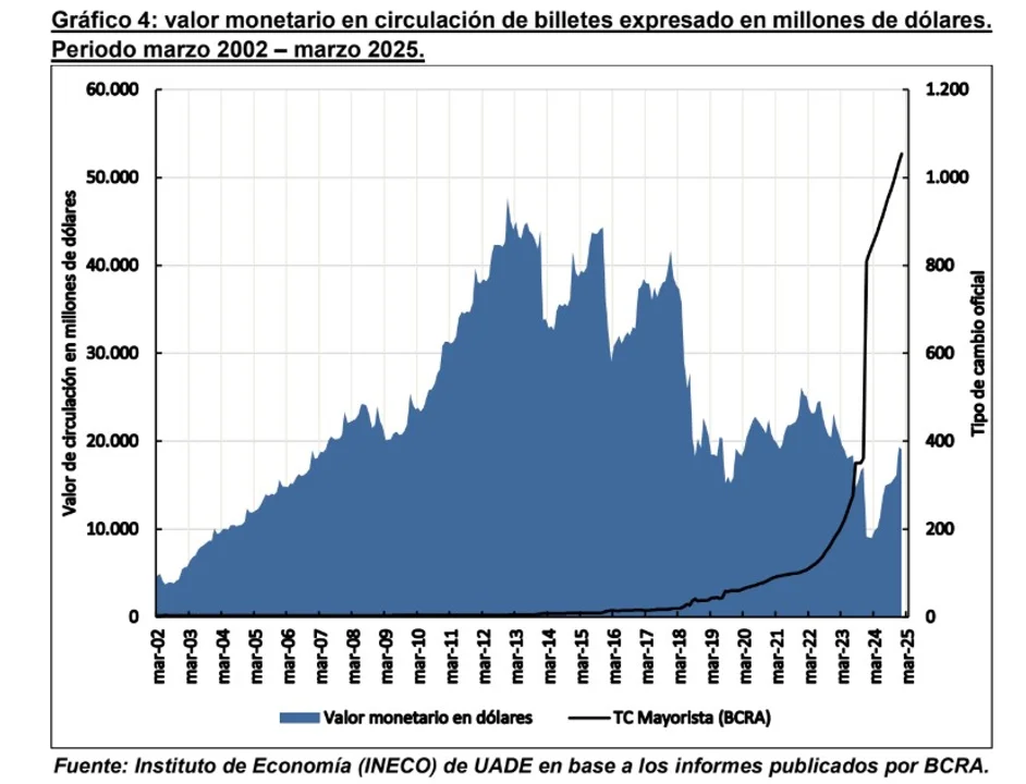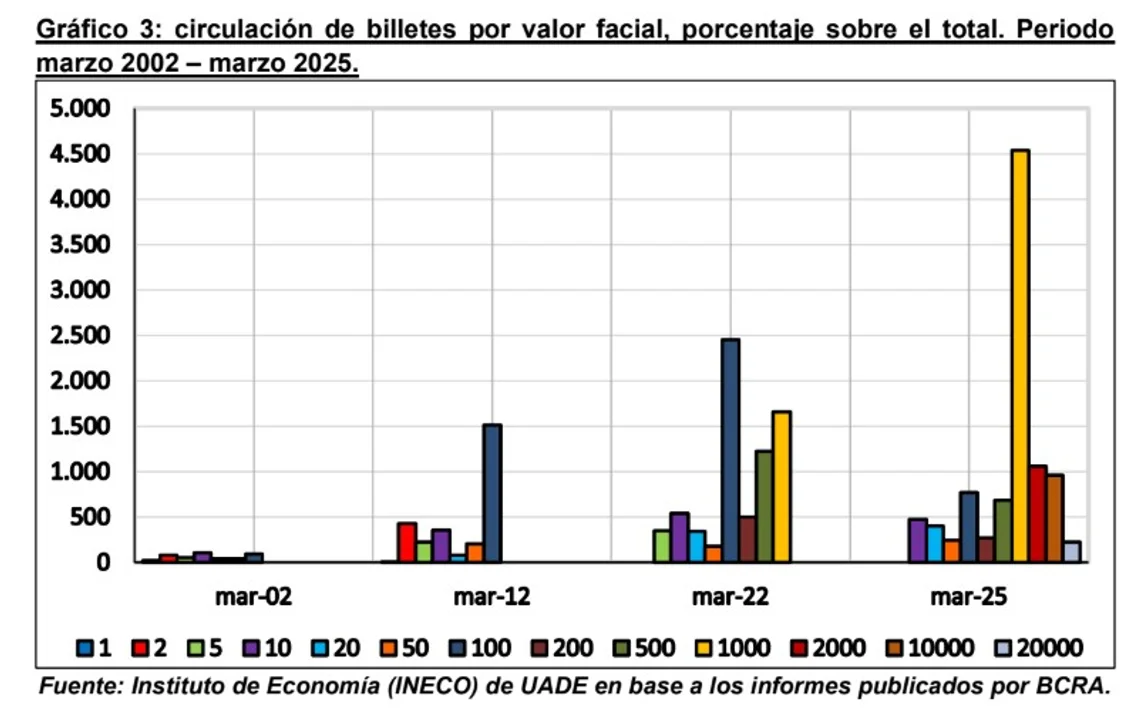 Desde abril de ese año se redujo la cantidad de billetes en circulación, posiblemente debido a un ajuste monetario o a cambios en la demanda de efectivo por parte del público, interpreta el INECO de UADE.