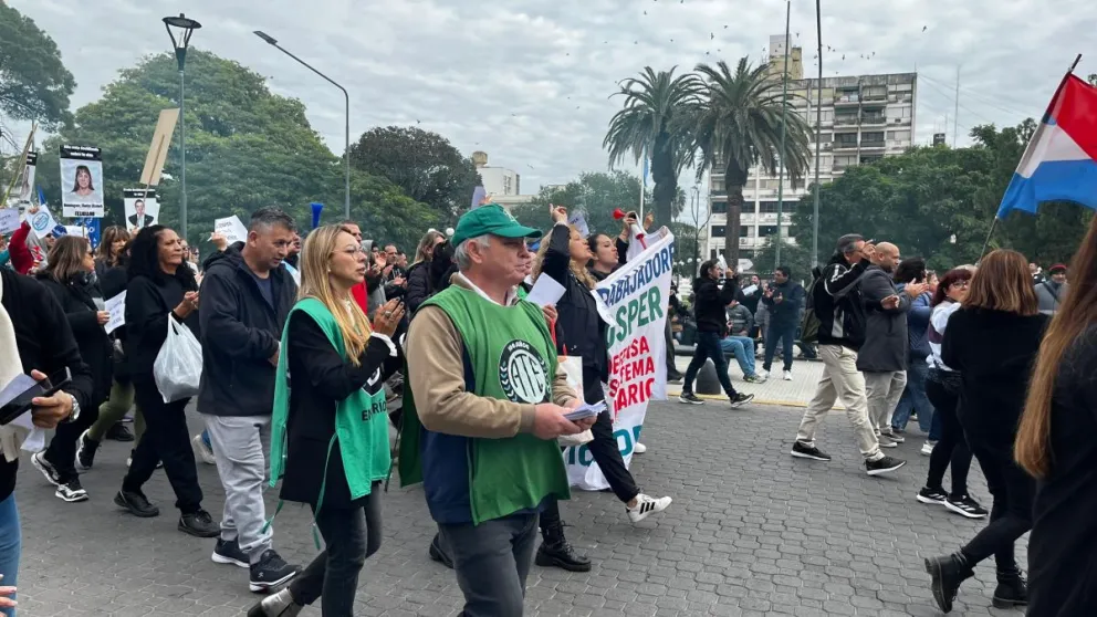 Mientras los manifestantes esperaban para salir, un grupo pegaba carteles que acusaban al interventor del IOSPER, Mariano Gallegos, de haber vaciado la Obra Social de la Ciudad de Buenos Aires (Obsba). También se veían muchas banderas de Entre Ríos y cartelería con la principal consigna del día: “El Iosper no se vende”.