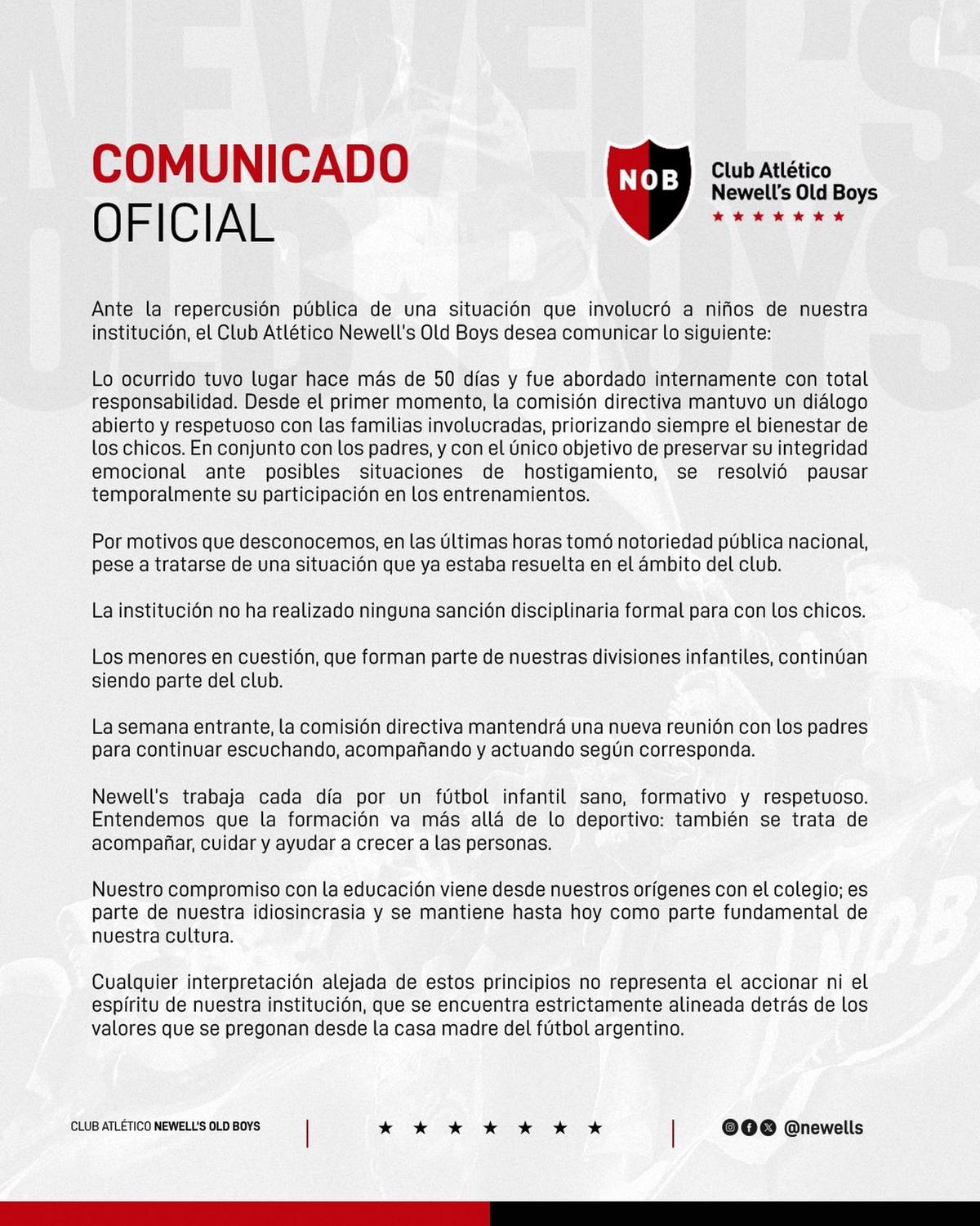 “Desde el primer momento, la comisión directiva mantuvo un diálogo abierto y respetuoso con las familias involucradas, priorizando siempre el bienestar de los chicos, en conjunto con los padres y con el único objetivo de preservar su integridad emocional ante posibles situaciones de hostigamiento”, afirmó Newell’s.