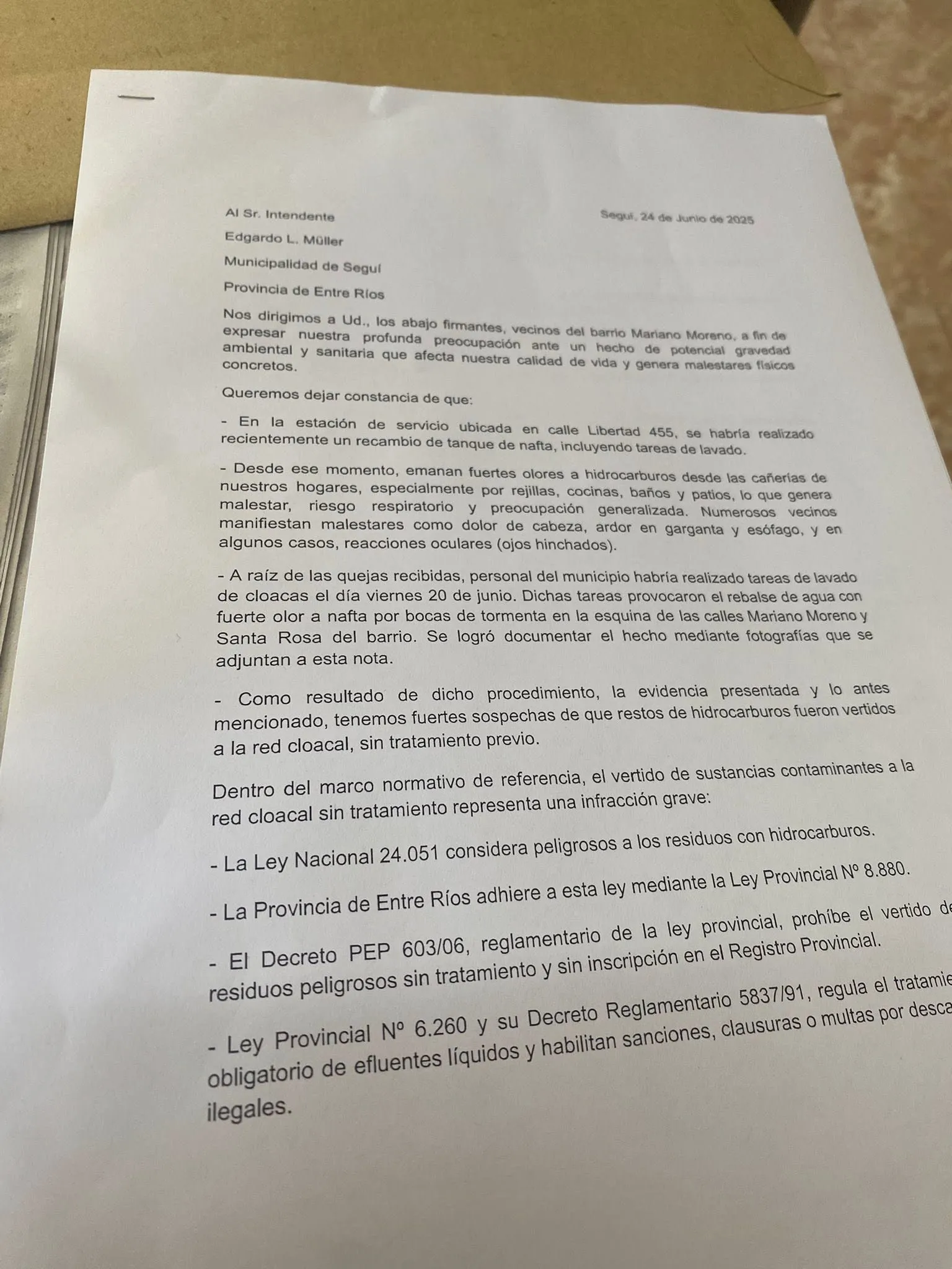 Este miércoles, un grupo de vecinos del barrio Mariano Moreno de Seguí elevó una nota al intendente Edgardo Müller para expresar su “profunda preocupación” por un hecho que consideran de “potencial gravedad ambiental y sanitaria”.
