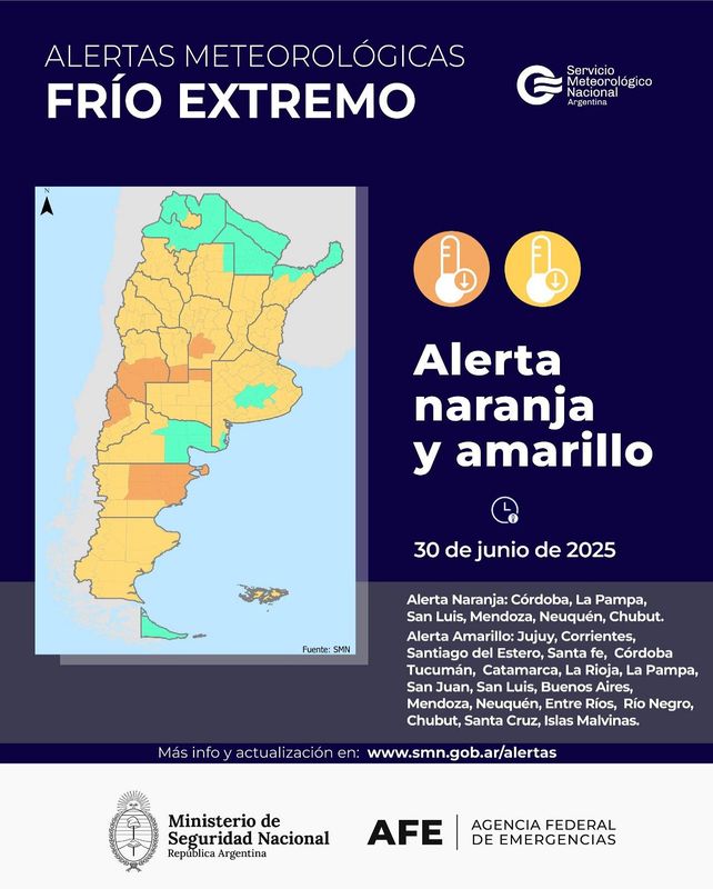 Las provincias bajo alerta naranja enfrentarán temperaturas extremas, lo que puede generar riesgos graves para la salud, como hipotermia o congelación. Las áreas afectadas son:Córdoba