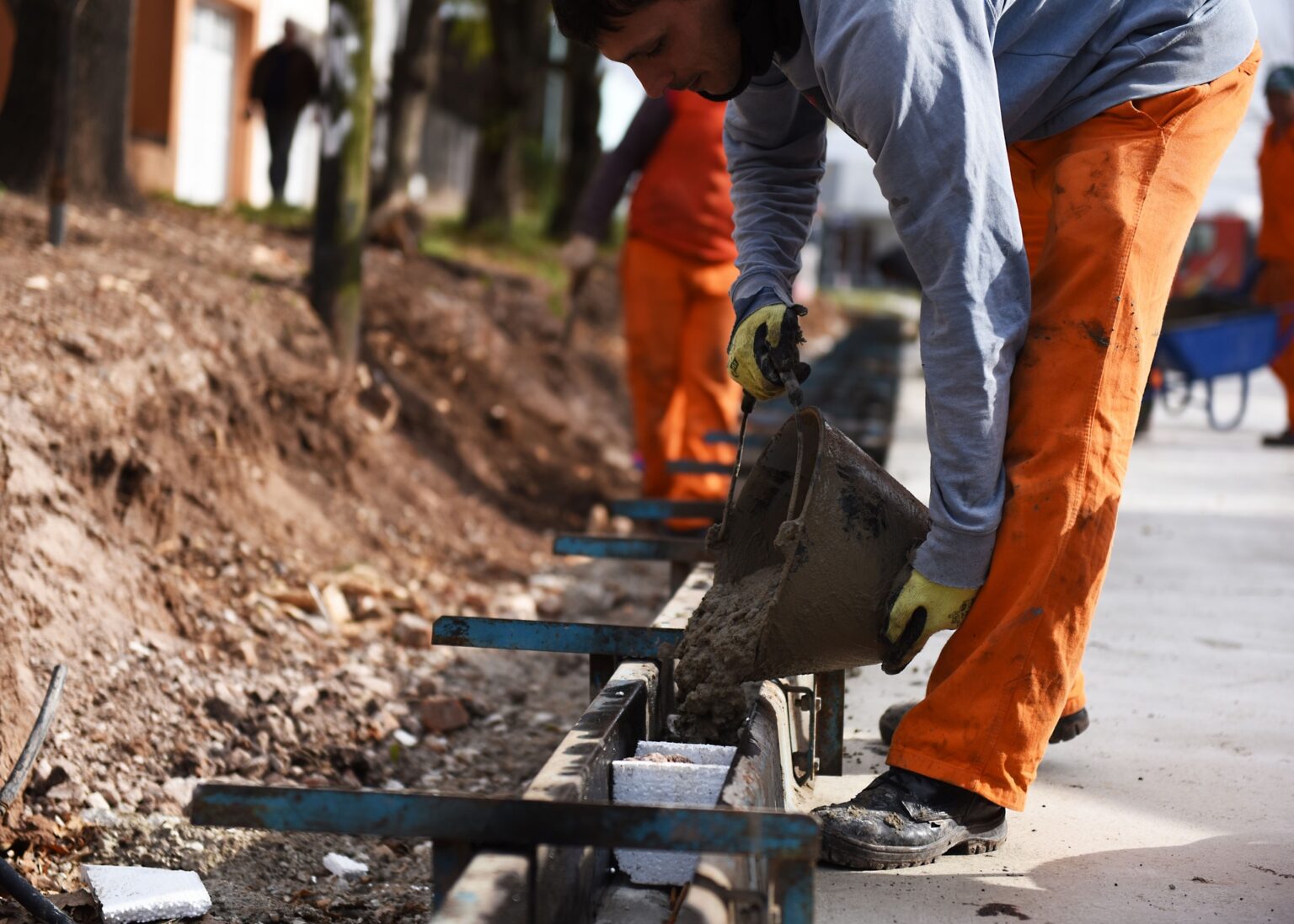 Personal del municipio trabaja en la ejecución de pavimento de cuatro cuadras de la trama vial urbana, en distintos barrios de la ciudad. Las obras avanzan en calle Güemes.