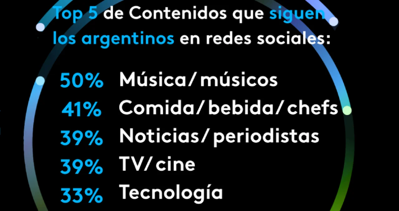 • Los principales contenidos que consumen los argentinos: el 50% música, 41% comida, 39% noticias, 39% cine/televisión y 33% tecnología.
