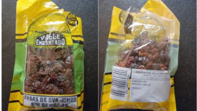 La ANMAT prohibió la elaboración, fraccionamiento y comercialización de las “Pasas de uva jumbo sin semillas, marca Valle Encantado”, medida que se tomó tras la detección de una piedra dentro de uno de los envases.