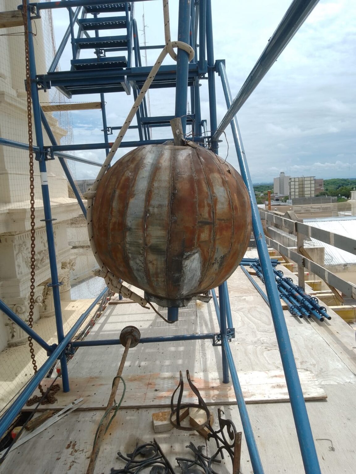 El pararrayos atraviesa la esfera de lado a lado y es parte del sistema histórico de protección del edificio. “Tuvimos que adaptar la estructura interna para que encaje exactamente con las medidas del pararrayos, que es más largo y más alto que el diámetro de la esfera”, explicó.