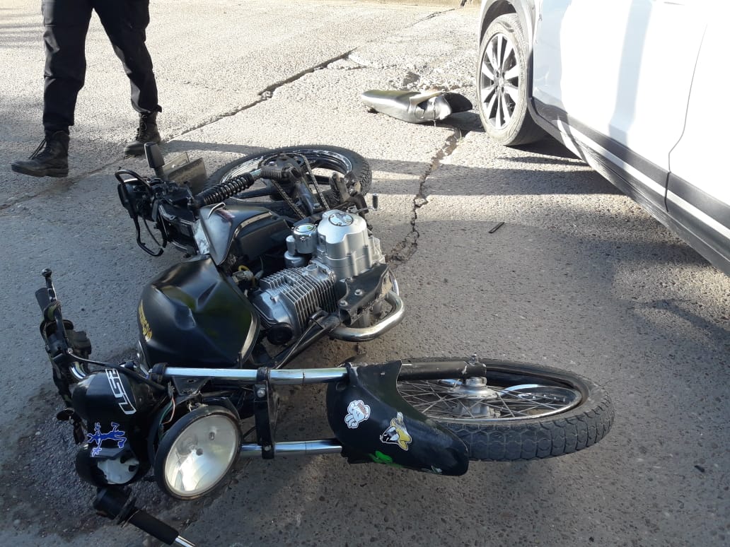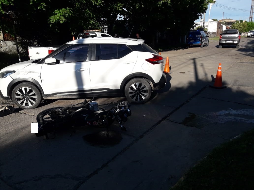 Por causas que se investigan, una motocicleta marca Guerrero impactó con un automóvil Nissan Kicks, lo que motivó la intervención de personal de Tránsito Municipal y Policía.