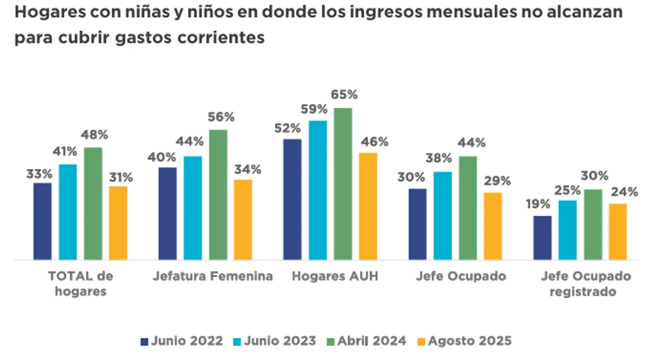 El número alcanzó al 30% de los hogares versus un 52% en 2024. Y dependiendo el sector social, el indicador varía en aumento o descenso: 45% en hogares con AUH (Asignación Univrsal por Hijo) y 37% en los hogares monoparentales con jefatura femenina.