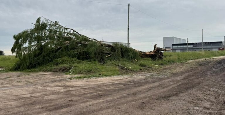 Desde el acceso Pte. Raúl Alfonsín hasta el Parque Industrial de Crespo, han quedado árboles y postes caídos, señales viales y persianas dobladas o en algunos casos arrancadas, techos de chapa volados, partes de construcción desplazadas y en ciertos casos, galpones con destrucción total.