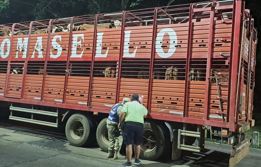 Alrededor de las 00:40 de este jueves, uniformados detuvieron la marcha de un camión jaula con semirremolque, precisamente cuando se disponía a abandonar el suelo entrerriano, en el marco de un traslado de hacienda que comenzó en Santo Tomé -provincia de Corrientes- y terminaría en Los Molinos -provincia de Santa Fe-.